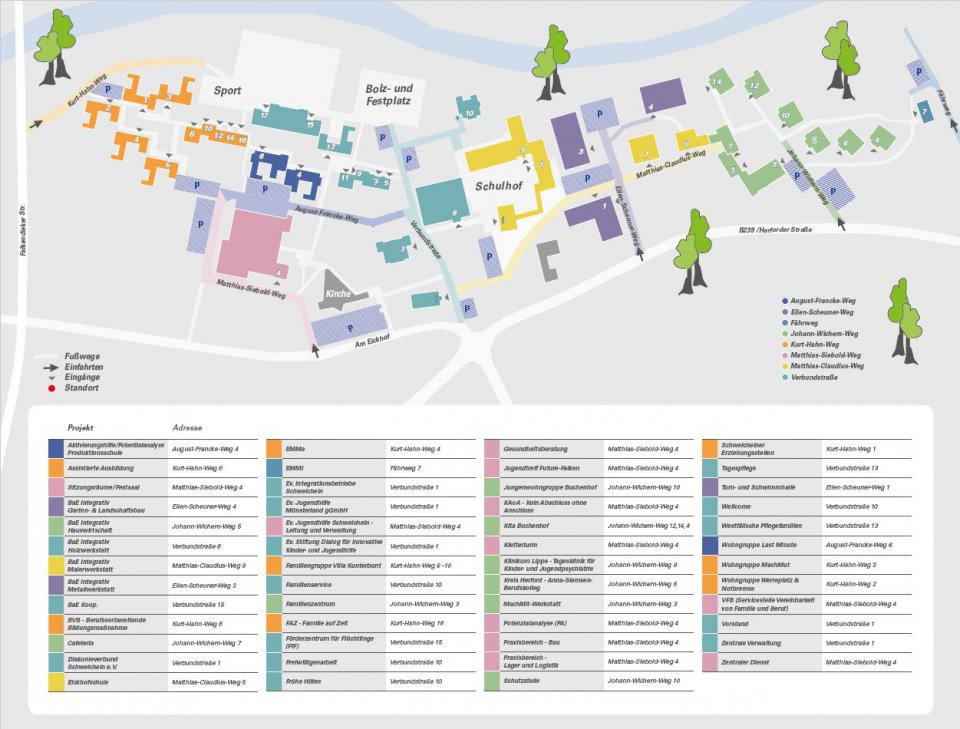 Sie befinden sich nun mittig auf dem Geländeplan vor dem Geländezugang am Gebäude Verbundstr. 1. In dem Gebäude befindet sich neben dem Diakonieverbund Schweicheln e.V. auch die Ev. Stiftung Dialog für innovative Kinder- und Jugendhilfe. Die Verwaltung der Ev. Jugendhilfe Schweicheln finden Sie links davon im Matthias-Siebold-Weg 4.